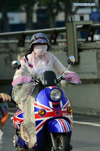 A woman wearing a sunbonnet rides an electric bike in the Jinshui District in Zhengzhou, capital city of central China's Henan Province, July 22, 2016. Heat hit Zhengzhou Friday as many places had temperatures over 37 degrees Celsius. Photo: Xinhua