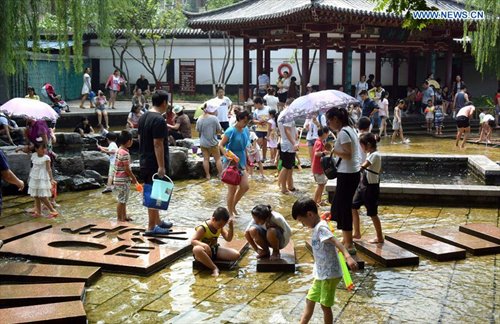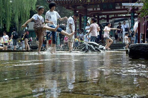 Residents enjoy cool water in Wulongtan Park in Jinan, capital city of east China's Shandong Province, July 22, 2016. As temperature rose, people choose their own ways to cool themselves. Photo: Xinhua