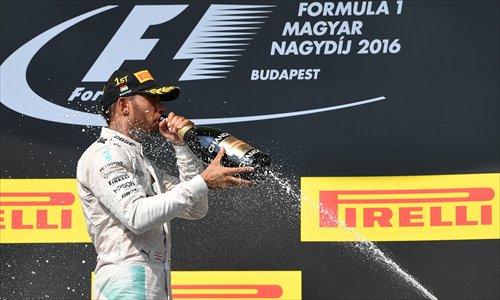 Mercedes driver Lewis Hamilton takes a sip of champagne on the podium at the Hungaroring circuit in Budapest on Sunday after winning the Hungarian Grand Prix. Photo: AFP