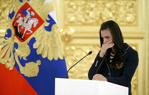 Russian Olympic pole vault champion Yelena Isinbayeva gestures as she speaks at the Kremlin in Moscow, Russia on Wednesday during a reception for Russia's Olympic team. The IAAF has barred Isinbayeva from competing in the Rio Olympics. Photo: IC