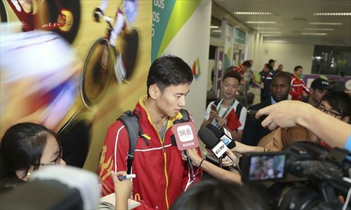 Chinese swimming athlete Ning Zetao receives an interview at the Galeao International Airport in Rio de Janeiro, Brazil, on July 31, 2016. The members of Chinese national swimming team arrived at Rio de Janeiro on Sunday. Photo:Xinhua