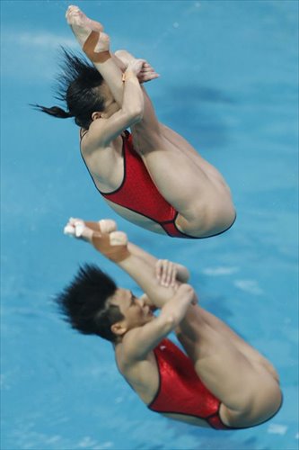 Chinese diving athletes Wu Minxia (top) and Shi Tingmao act during the final of women's SYNC.3M Springboard in Rio de Janeiro, Brazil, on Aug. 7, 2016. Wu Minxia and Shi Tingmao won the gold medal with 345.60. Photo:Xinhua
