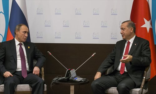 Russian President Vladimir Putin and Turkish President Recep Tayyip Erdogan talk to each other on November 16, 2015 in Antalya. Photo: IC