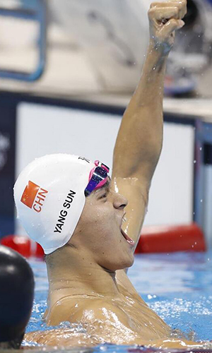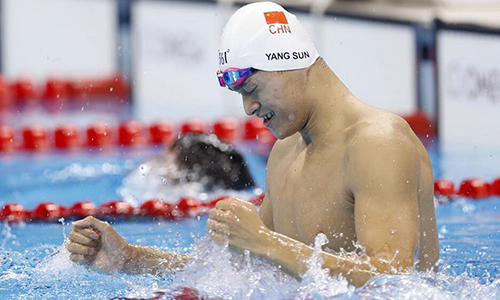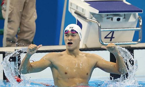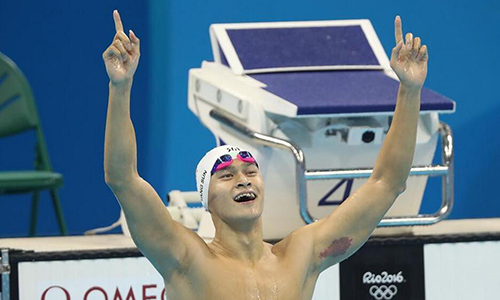 Sun Yang of China celebrates after the men's 200m freestyle swimming final at the 2016 Rio Olympic Games in Rio de Janeiro, Brazil, on Aug. 8, 2016. Sun Yang won the gold medal with 1 minute 44.65 seconds. Photo: Xinhua