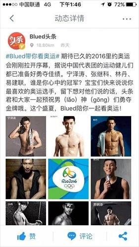 A viral screenshot of a post on Blued, a smartphone app developed exclusively for gay social networking, reads, "We wish athletes, or your dream husbands, a complete success. Blued is with you as you watch the Rio Games this summer!" The post was illustrated by a picture containing the phrase "Rio 2016" and the Olympic emblem.