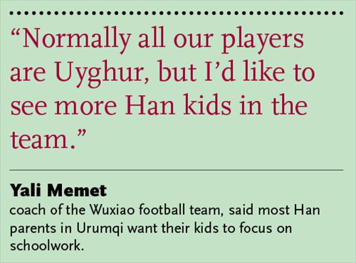 "Normally all our players are Uyghur, but I'd like to see more Han kids in the team," Yali said. Most Han parents in Urumqi want their kids to focus on schoolwork, and don't want them to spend much time on football, which frustrates Yali.
