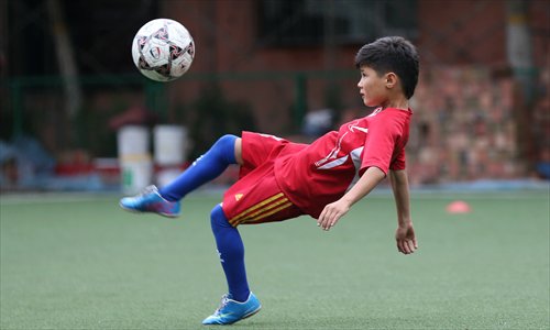 A member of the Urumqi No.5 Primary School football team trains on campus in Urumqi, the Xinjiang Uyghur Autonomous Region. Photo: Cui Meng/GT