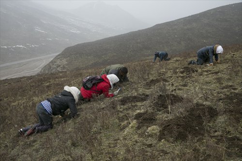 Villagers dig for caterpillar fungus on the slopes of the Qilian Mountains in Northwest China's Qinghai Province. Photo: CFP