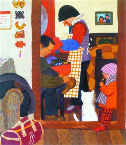 Zhu: Yes, I go traveling first and collect examples of that place. It's the best way to turn words into pictures. Even if a book's text is brushed lightly, the picture must always be solid. Details are very important to me. For example, the rabbit lamp in New Year's Reunion was an important part of Spring Festival when I was young. Most of the pieces I have drawn are based on real subjects, real experiences.