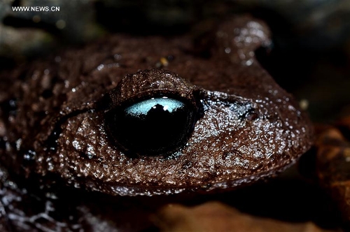 File photo shows a new amphibian species of the genus Leptolalax, commonly known as the Asian litter frog, found in Tengchong, southwest China's Yunnan Province. The new species, Leptolalax tengchongensis, was spotted in the Tengchong Section of Gaoligong Mountain National Nature Reserve in the west of Yunnan, and was named after the county of Tengchong. (Xinhua)