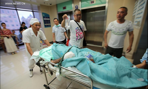 An injured victim arrives in the Hospital Affiliated to Nantong University to receive medical treatment in Nantong, east China's Jiangsu Province, August 2, 2014. Photo: Xinhua