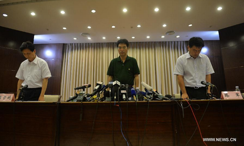 A press conference on a factory blast is held in Kunshan City, east China's Jiangsu province, August 2, 2014. Photo: Xinhua