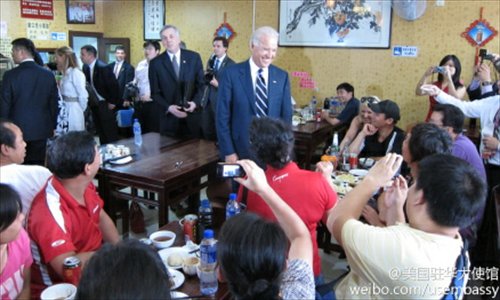 US Vice President Joe Biden and his staff eat at Yao Ji Stewed Liver, a small restaurant set in a traditional alley near Beijing's Drum Tower on August 18, 2011. Photo: weibo.com