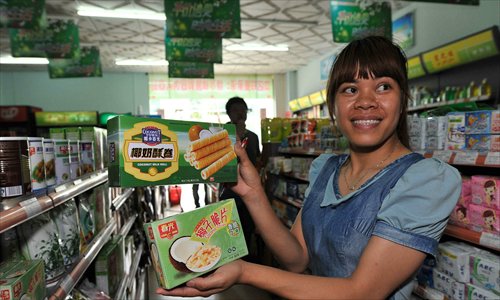 A shopkeeper in Haikou, Hainan Province shows the "Premier's combo," which is two packs of coconut snacks on Friday. Premier Li Keqiang bought the snacks in her shop and triggered local residents snapping up the 19 yuan ($3) "package." Photo: IC