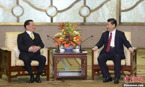 Xi Jinping (R), general secretary of the Communist Party of China Central Committee, meets with Kuomintang Honorary Chairman Lien Chan in Beijing, capital of China, February 18, 2014. Photo: Xinhua