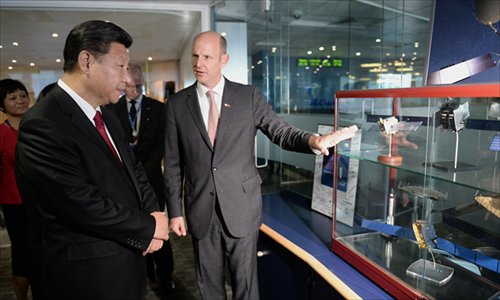 Sharing one umbrella in typical London rain, Chinese President Xi Jinping and Britain's Prince William viewed a James Bond sports car from Britain's iconic automaker Aston Martin that will be equipped with an entertainment system with Chinese technology.