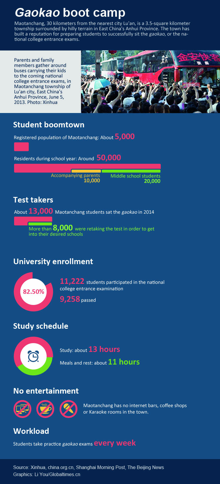 From June to August, Maotanchang is pretty much a ghost town. But come the end of August, the town swells from 5,000 residents to more than 50,000. Most are students coming to study and prepare for the college entrance exam.