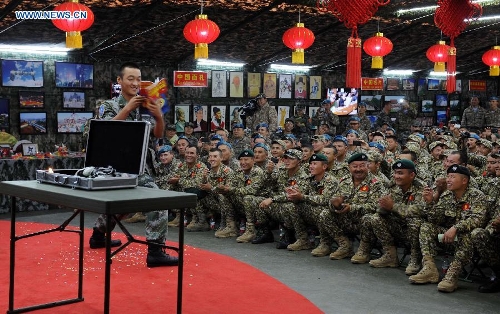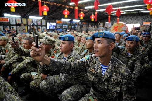 Soldiers from Kazakhstan watch the performance of traditional Chinese art ahead of the Peace Mission-2014 anti-terror drill at the Zhurihe training base, North China's Inner Mongolia Autonomous Region, August 23, 2014. Photo: Xinhua