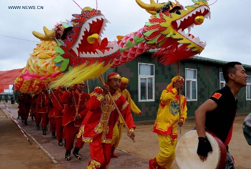 Chinese soldiers perform the dragon dance for foreign participants ahead of the Peace Mission-2014 anti-terror drill at the Zhurihe training base, North China's Inner Mongolia Autonomous Region, August 23, 2014. Photo: Xinhua