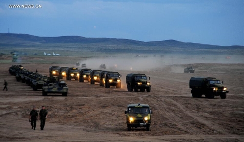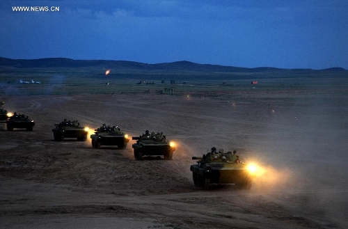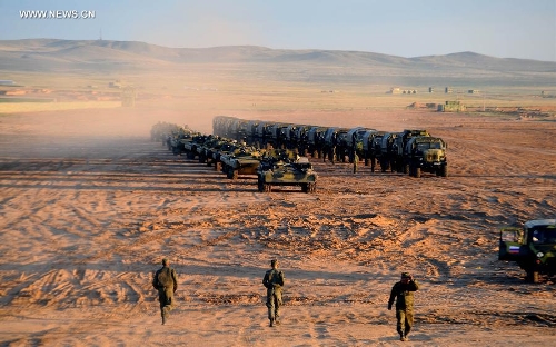 Armoured vehicles of foreign troops concentrate at the Zhurihe training base, North China's Inner Mongolia Autonomous Region, August 16, 2014. Photo: Xinhua