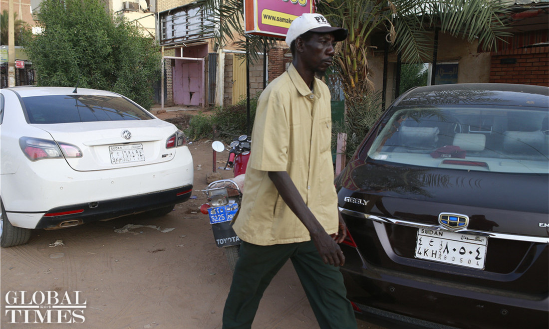 A man walks past a parked Geely brand sedan on a street in Sudan. Photo: Li Hao/GT figcaption >