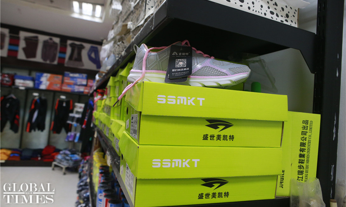 Pairs of shoes by Chinese athletics brand SSMKT are sold in a local store. Photo: Li Hao/GT figcaption >