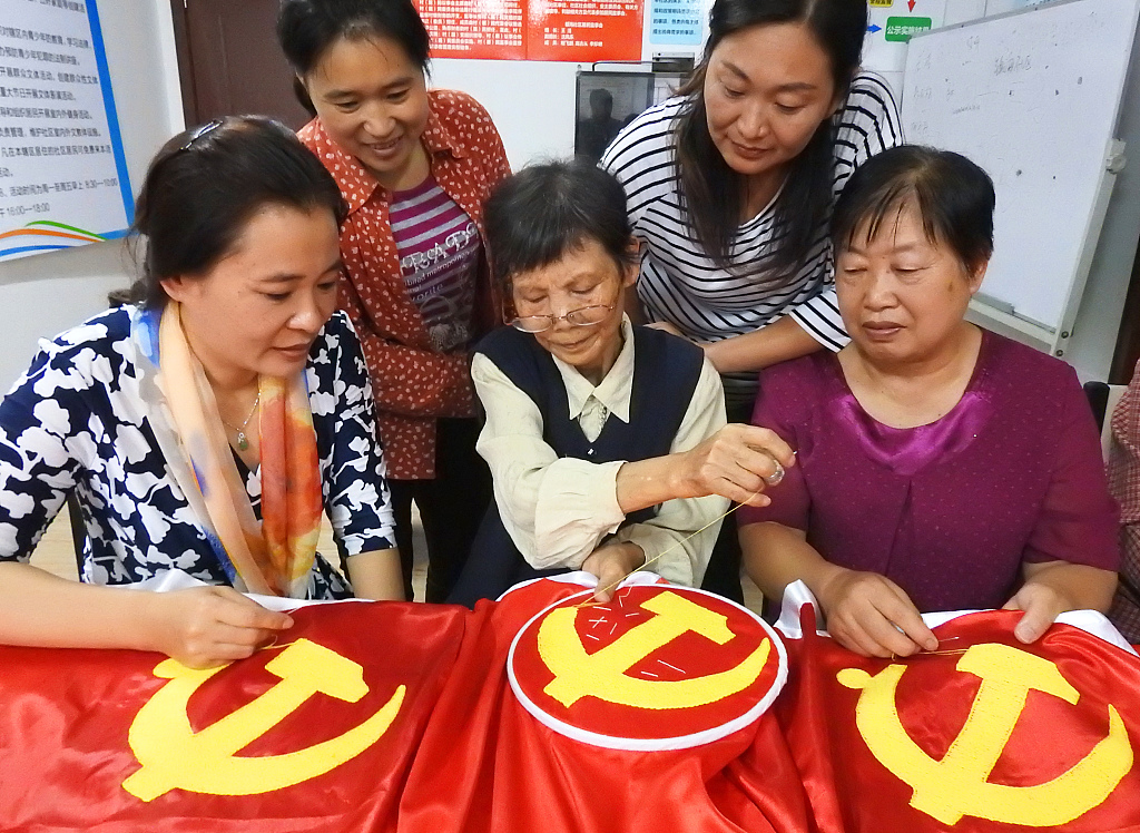 Xu Yunxiu (middle), 72, instructs how to embroider CPC Party flags on September 25, 2017. Photo: VCG figcaption >