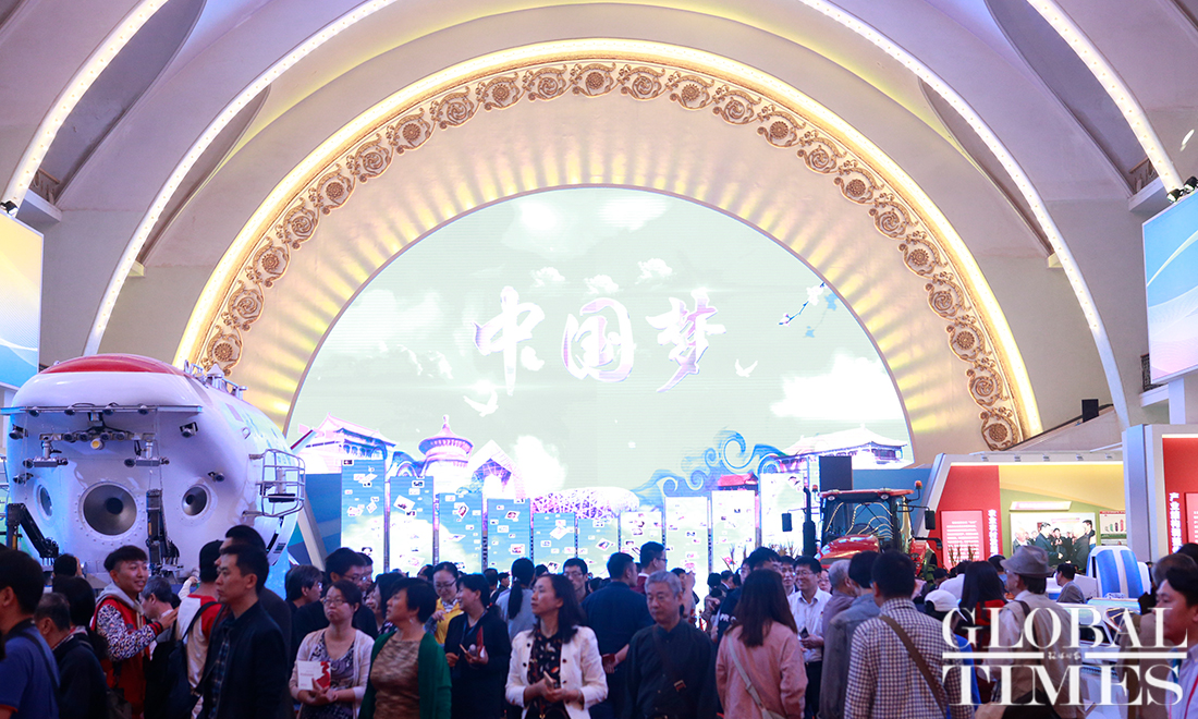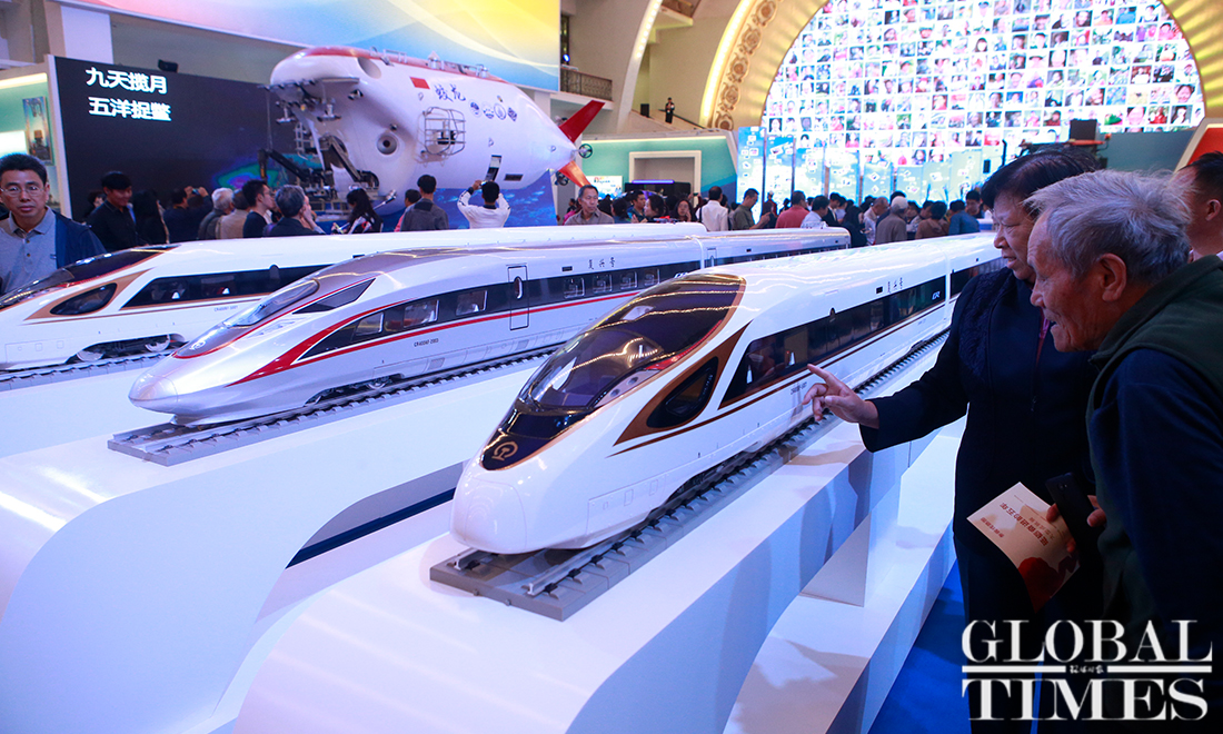 A senior couple take a close look at the model of a new high-speed Fuxing train, China's next-generation bullet train, at the exhibition on September 29. Photo: Li Hao/GT
