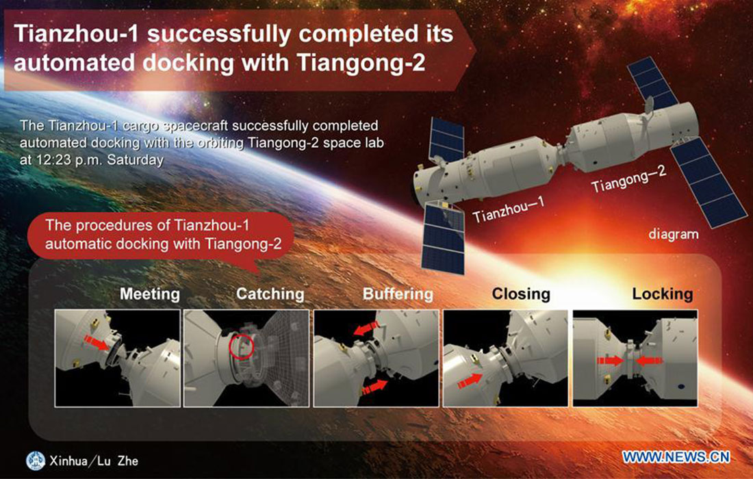 The Tianzhou-1 cargo spacecraft successfully completed automated docking with the orbiting Tiangong-2 space lab on April 22, 2017. (Photo: Xinhua/Lu Zhe) figcaption >