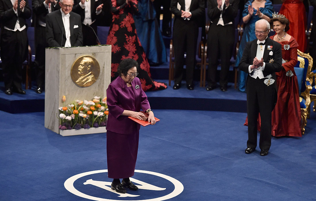 Tu Youyou, laureate of the Nobel Prize in Physiology or Medicine acknowledges applause after she received her Nobel Prize from King Carl XVI Gustaf of Sweden during the Nobel Prize Awards Ceremony at Concert Hall on December 10, 2015 in Stockholm, Sweden. Photo: Pascal Le Segretain/WireImage/VCG figcaption >