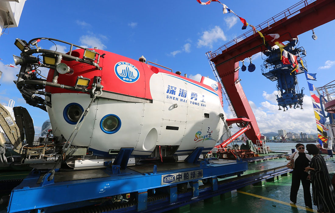 China’s new manned submersible Shenhai Yongshi, pictured aboard the ship Tansuo-1, returns to port in Sanya on October 3 after completing deep sea tests in the South China Sea. Photo: VCG figcaption >