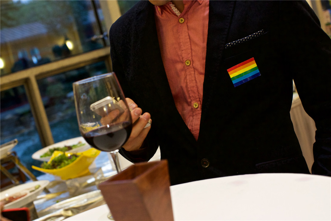 A wedding guest wears a rainbow flag, a symbol of gay pride, on his coat as a show of support. Ling and Gino invited nearly 200 guests to their wedding, most of which are gay.