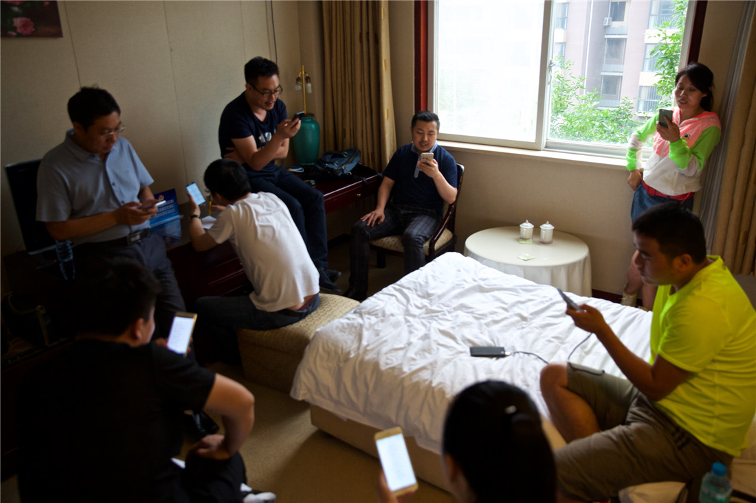 Twenty-seven-year-old Gino (left) and Ling Jueding, 34, kiss during their wedding ceremony in Beijing on June 27. The couple first met in 2013 at an event held by Ling’s company, the developer of a gay social networking app. "At first glance I thought he [Ling] was a little bit girly, not at all like his manly photo, and we didn’t talk much at first.” Gino told ifeng.com. “It was only afterward when he would find work-related reasons to ask me out to coffee that we got to know each other. But now it seems he’d been planning the whole thing all along," he said. Photos: Feng Zhonghao