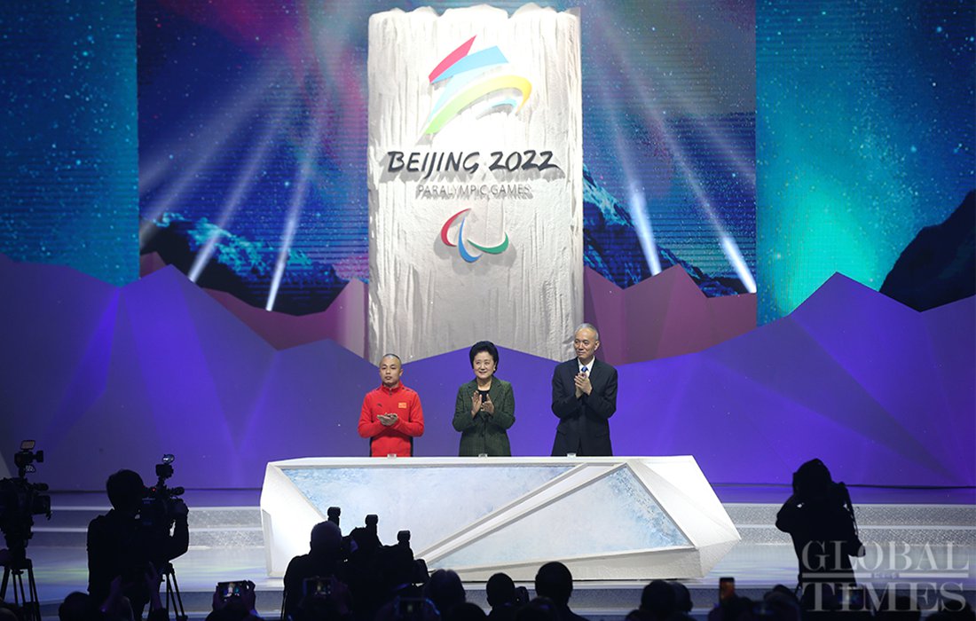 Chinese Vice Premier Liu Yandong unveils the emblem for the Beijing 2022 Paralympic Winter Games in Beijing on December 15. Photo: Cui Meng/GT figcaption >