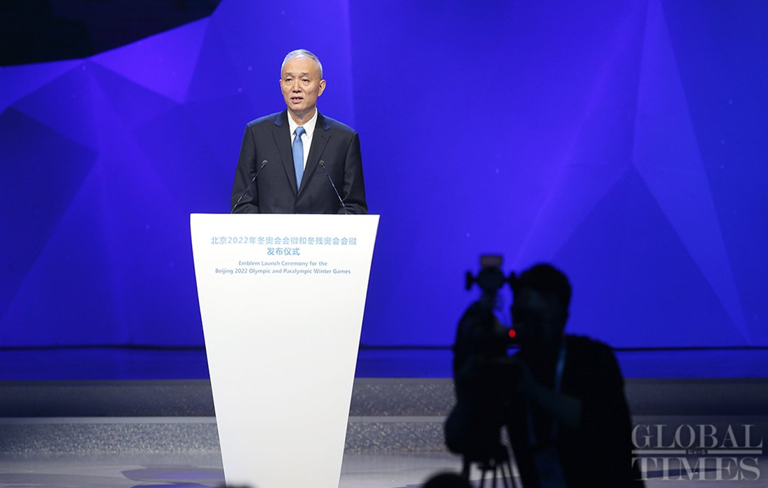 Cai Qi, secretary of the Communist Party of China Beijing Municipal Committee and president of the Beijing 2022 Organizing Committee, delivers a speech at the unveiling ceremony for emblems of the Beijing 2011 Winter Olympics in Beijing on December 15. Photo: Cui Meng/GT figcaption >