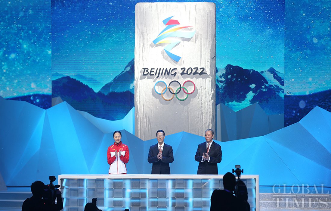 Chinese Vice Premier Zhang Gaoli unveils the Beijing 2022 Winter Olympic Games emblem in Beijing on December 15. Photo: Cui Meng/GT