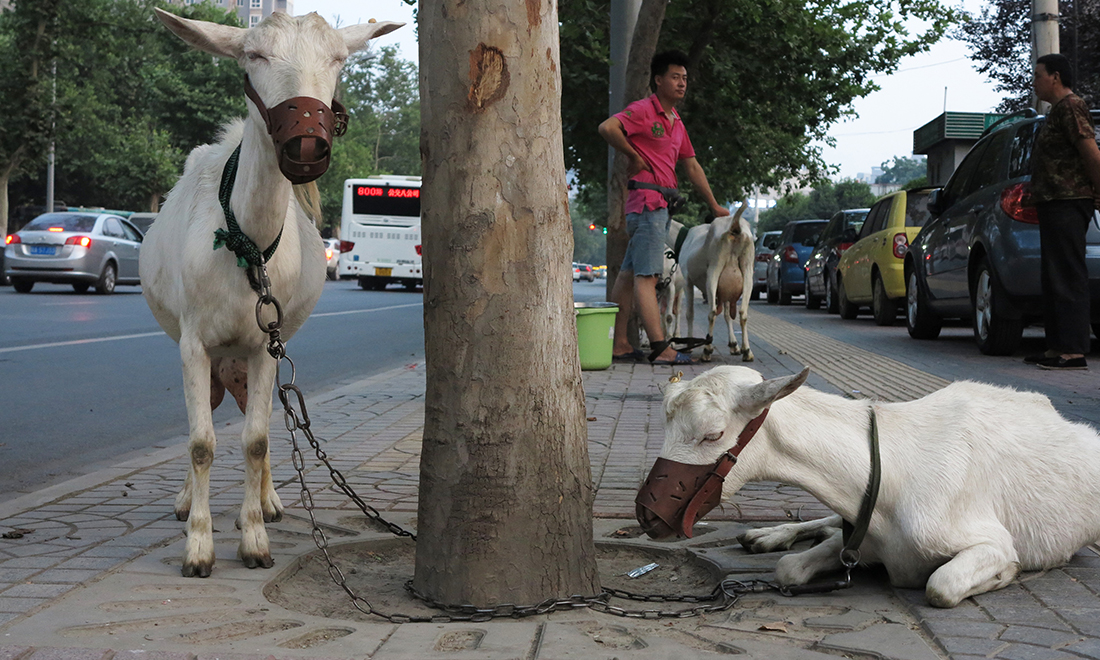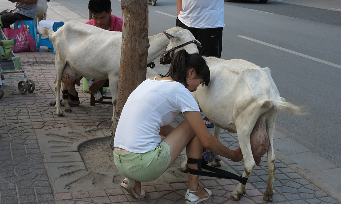 A young couple took their teats to the streets of downtown Xi'an, Shaanxi Province, selling milk squeezed fresh to order from four goats, according to China News Service.