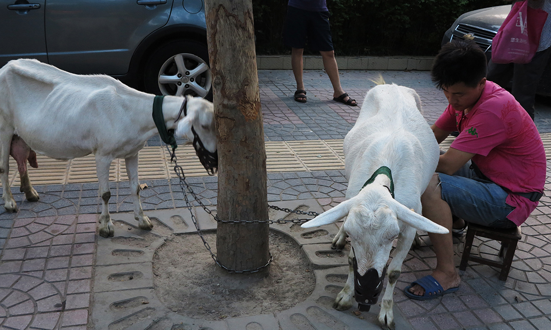 A customer waits as the couple squeeze milk from the tethered goats. Photo: CFP figcaption >