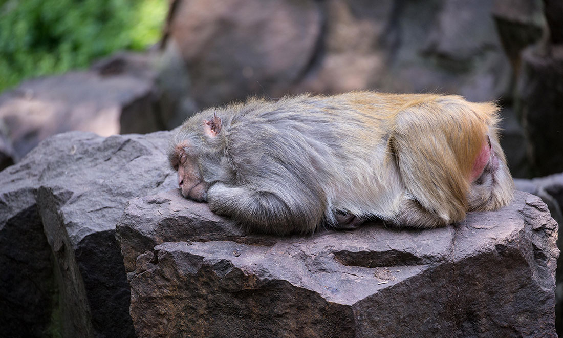 A monkey sleeps on a rock at Hangzhou Zoo in Zhejiang on May 6. Photo: CFP figcaption >