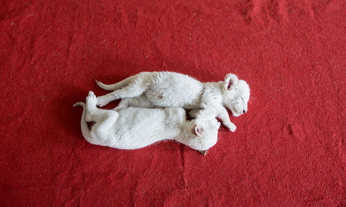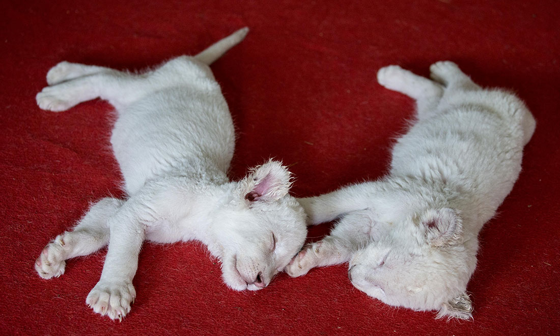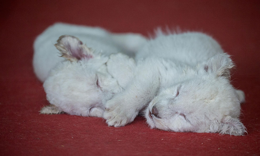 Two newborn white lions sleep at Hangzhou Wildlife World in Zhejiang Province on April 27. There are only about 100 white lions in the world. Photo: CFP figcaption >