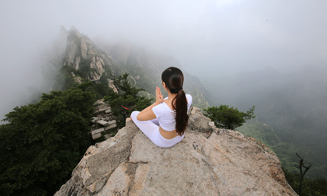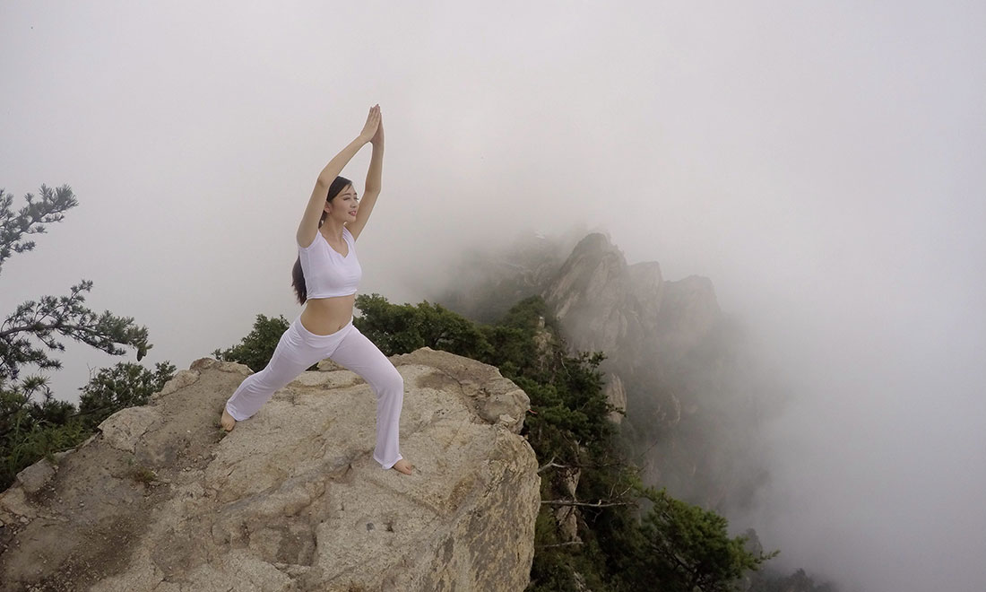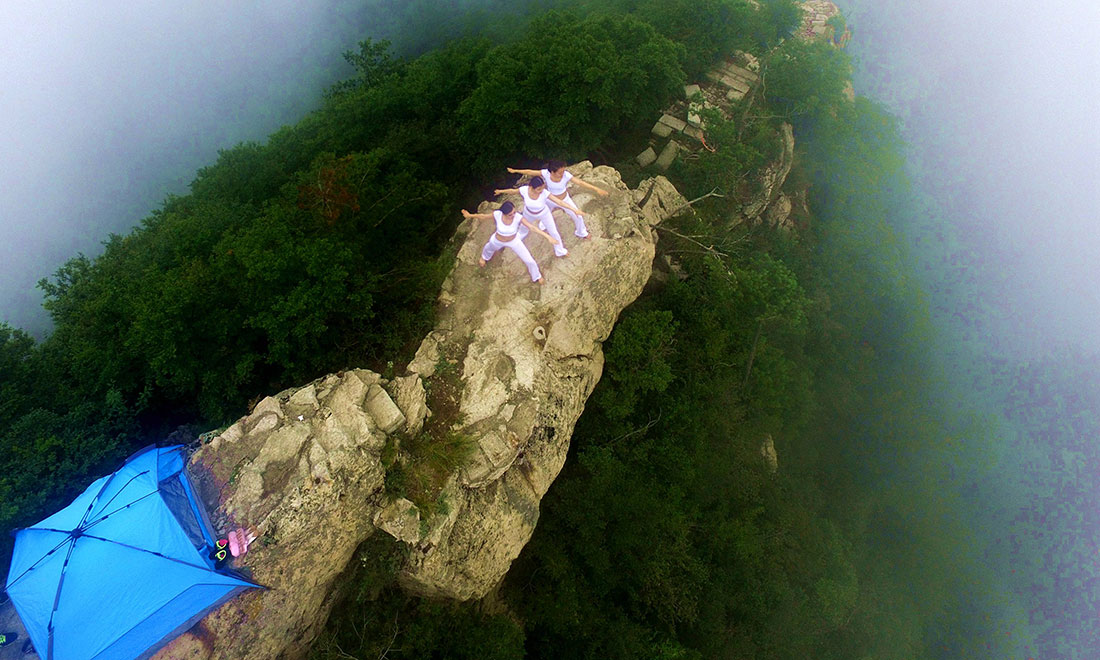 Three women practice yoga on a 2,000-meter high precipice on Funiu Mountain, Central China’s Henan Province during the Laojun Mountain Camping Festival in Luoyang on July 18. Photo: CFP