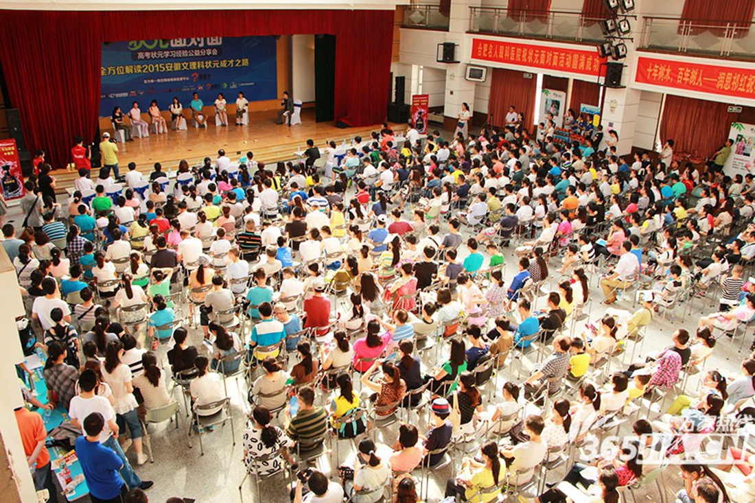 Seven top scorers in Anhui Province share their experiences with more than 600 students and parents in Hefei City Library on July 12. Photo: 365jia.cn figcaption >