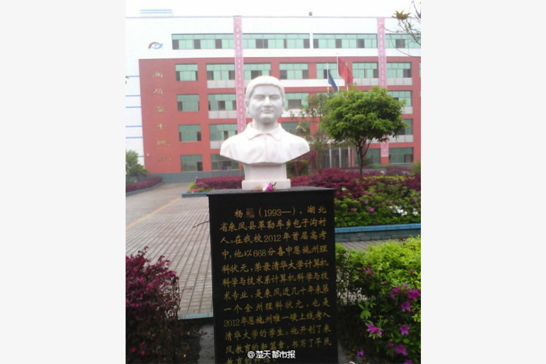Schools sometimes celebrate their scholarly sons and daughters in unconventional ways. In 2013, a private middle school in Laifeng county, Enshi Tujia and Miao Autonomous Prefecture, Hubei Province, unveiled a statue to celebrate a former student surnamed Yang who was Enshi’s zhuangyuan in 2012. The bust was later removed at the suggestion of local education authorities, who called it “inappropriate,” Chutian Jinbao reported. Photo: Chutian Metropolis Daily figcaption >
