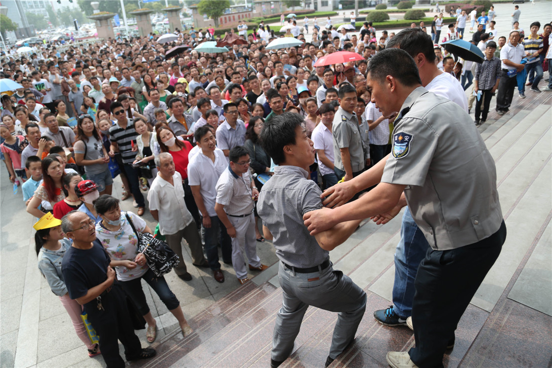 Security guards at Qingjiang Middle and High School stop a parent from trying to enter as parents line up to register their children in Huai'an, Jiangsu Province on June 2, 2015. Photo: CFP figcaption >