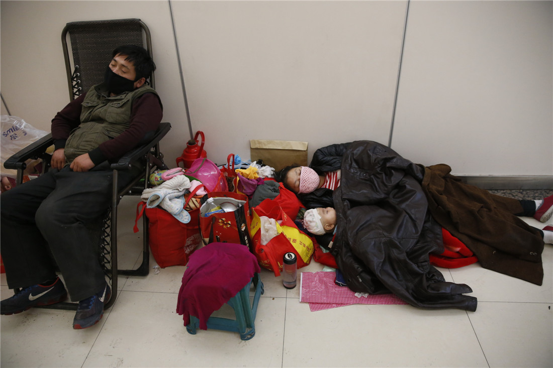 A couple from Xianyang, Shaanxi Province and their baby sleep in a hallway at Xi'an Children's Hospital in Xi'an, capital of Shaanxi Province on December 22, 2014. The couple had been living in the hospital hallway for seven days so that their child may have a chance at seeing a doctor. The winter brought an increase in parents seeking treatment for their children to the hospital, where many parents were forced to line up for registration at the crack of dawn. Photo: CFP figcaption >