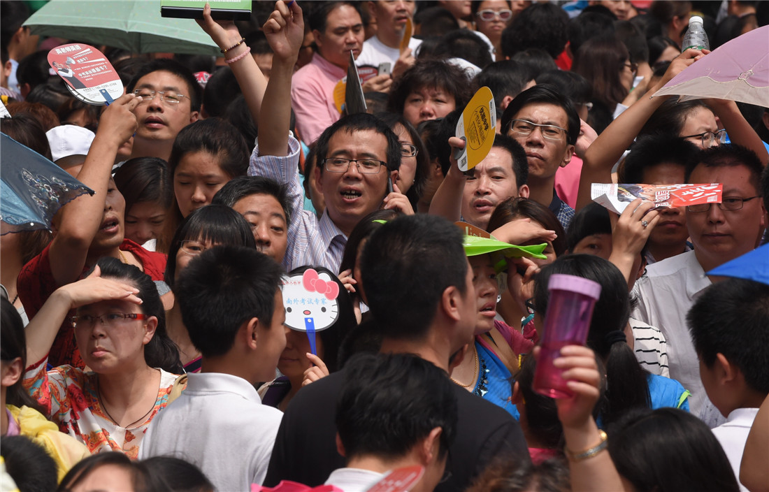 A crowd of parents wait in the summer heat as their children take entrance examinations at the Nanjing Foreign Language School in Nanjing, Jiangsu Province on July 4, 2015. Photo: CFP figcaption >