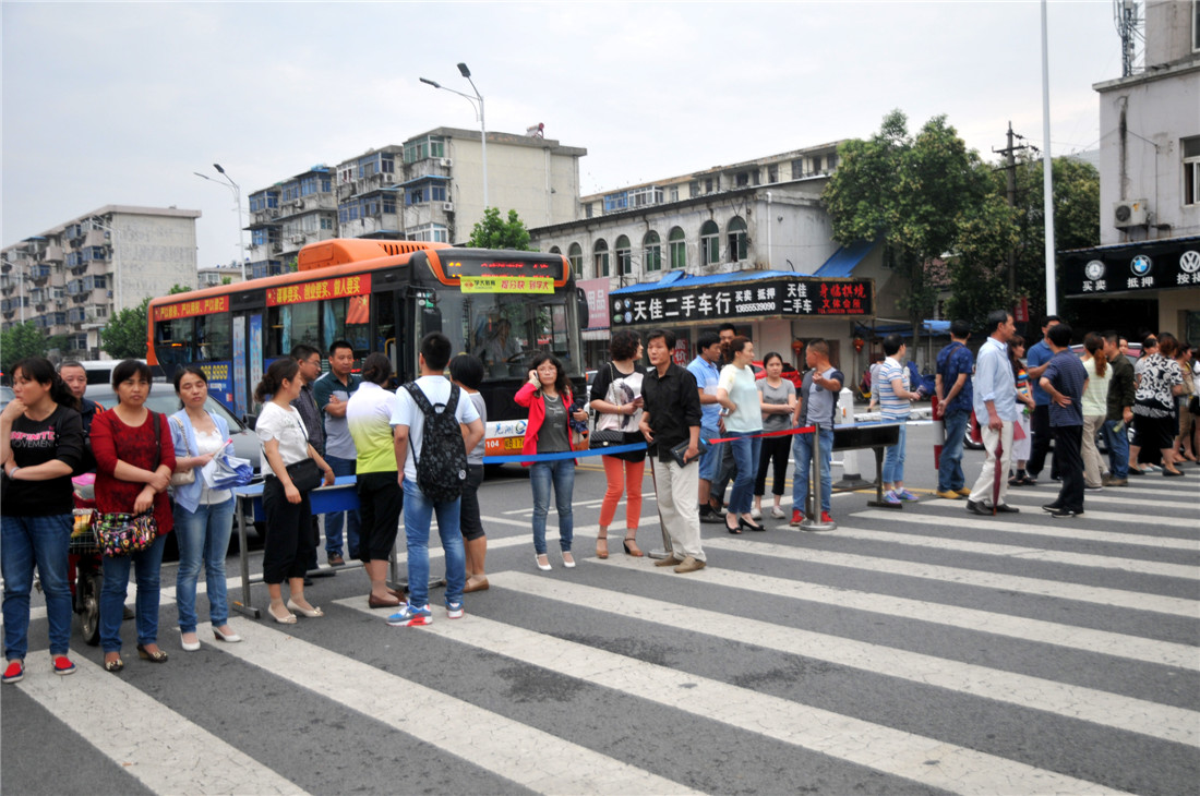 Parents stand at an intersection to deter traffic near a gaokao site in Nanjing, Jiangsu Province on June 8, 2014. Although local traffic authorities had taken measures to limit traffic during English listening exams, some parents voluntarily worked to keep traffic noise to a minimum. Photo: CFP figcaption >
