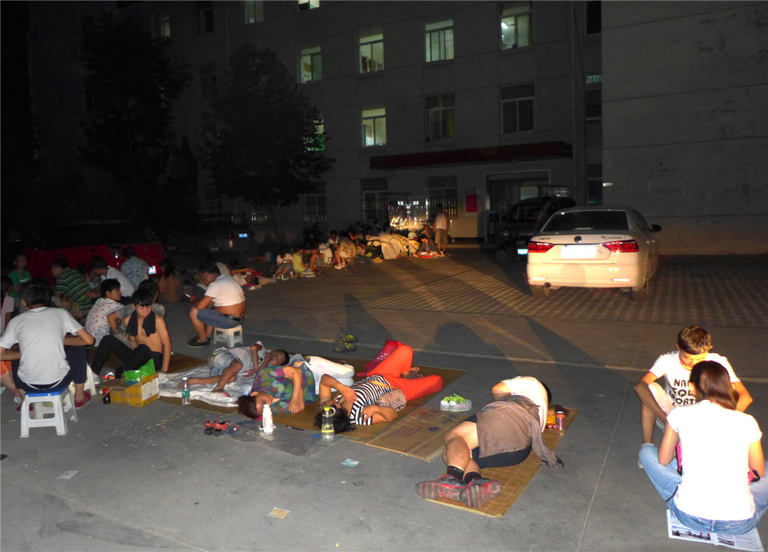 Parents camp outside a local hospital to make sure their children get a physical exam as required by their school on the night of July 29, 2015 in Tongchuan, Shaanxi Province. According to some students and parents, the school required students to take physical examinations at designated hospitals before the new term began. Parents and students queued overnight to take the examination. Photo: CFP figcaption >