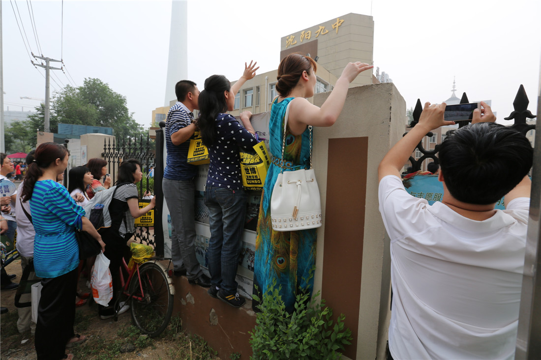 Parents wait anxiously outside the Shenyang No.9 High School for their children during the national high school entrance examinations in Shenyang, Liaoning Province on June 27, 2015. Photo: CFP figcaption >