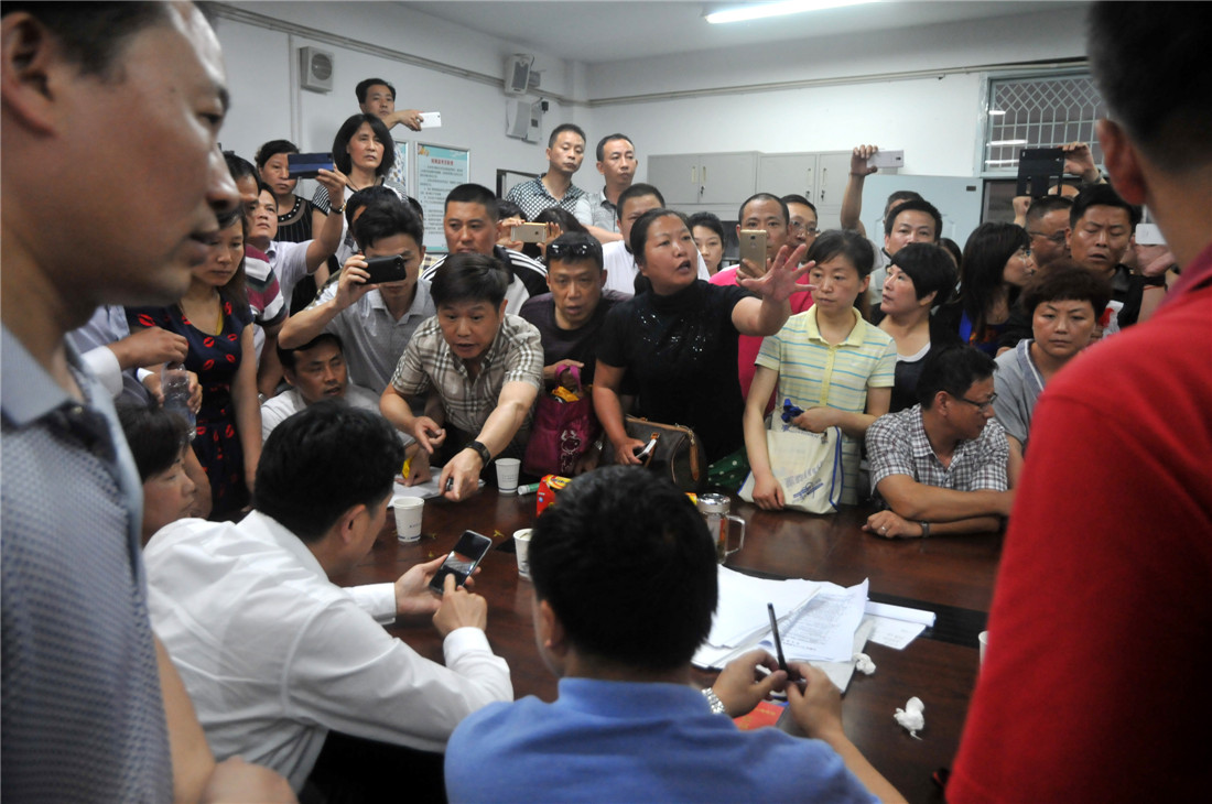 Local government officials meet with angry parents in Wuhu, Anhui Province on June 8, 2015. Photo: CFP figcaption >